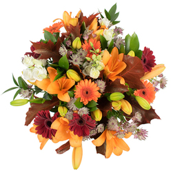 Embrace the colder days with our vibrant and unique flower arrangement, meticulously crafted to bring warmth and joy to any space. This stunning bouquet features a harmonious blend of lush roses, cheerful gerberas, and elegant alstroemeria, accented by oak leaves and fresh greenery.